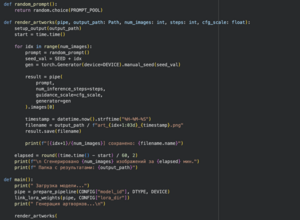 Ниже фрагмент кода, который реализует автоматическую генерацию нескольких изображений по случайным промптам с уникальными seed-значениями, и сохранение их в указанную папку. Каждый цикл — новый промпт, новое изображение, что позволяет получать разнообразные работы без ручного влияния.