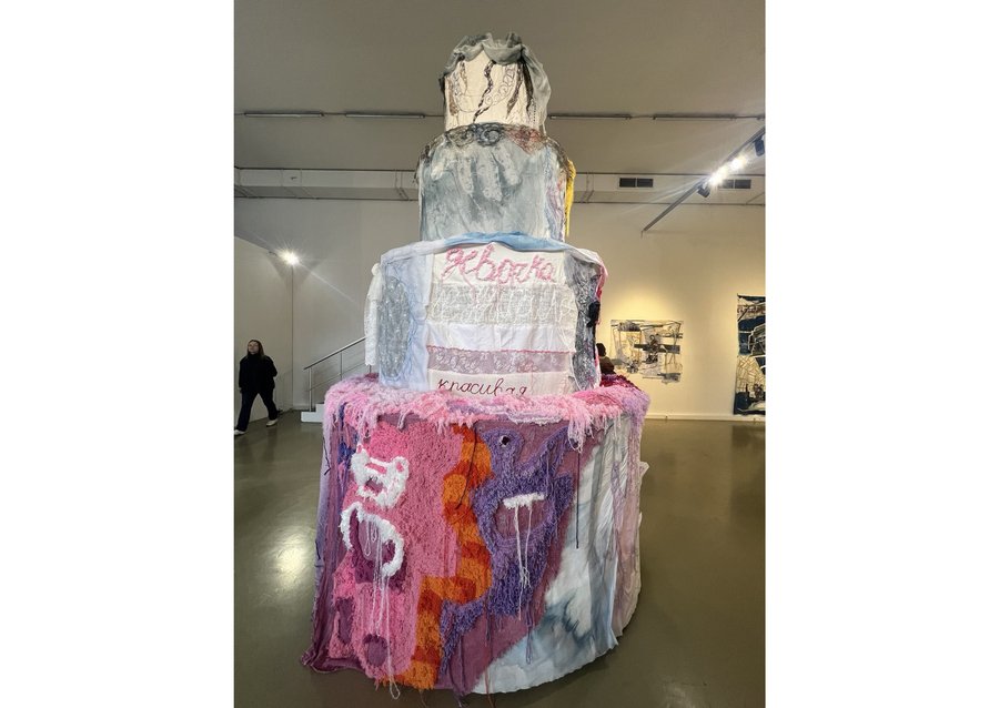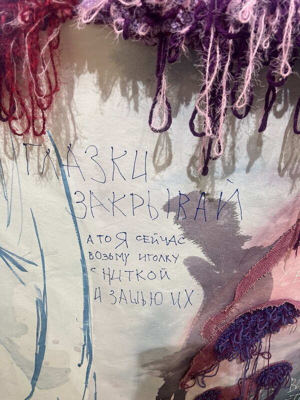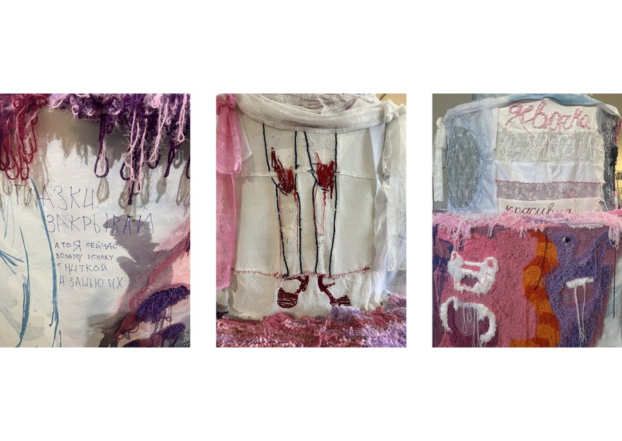 Как отмечает куратор, текстиль здесь — «и текст, и текстура», где стежки складываются в слова, а узоры — в исповеди. Текстиль действительно «пишется»: он рассказывает истории — иногда личные (как в работах, посвященных материнству или детским страхам), иногда социально-политические (например, в работе Егора Федоричева «Лебединое озеро», 2023).