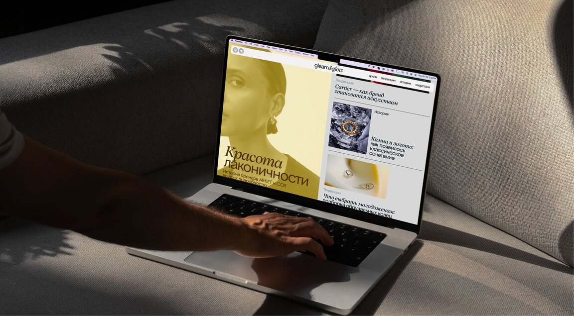Хорошо — стилизованный фон, интересный мокап ноутбука; Плохо — экран ноутбука почти сливается с фоном, получается «дырка»