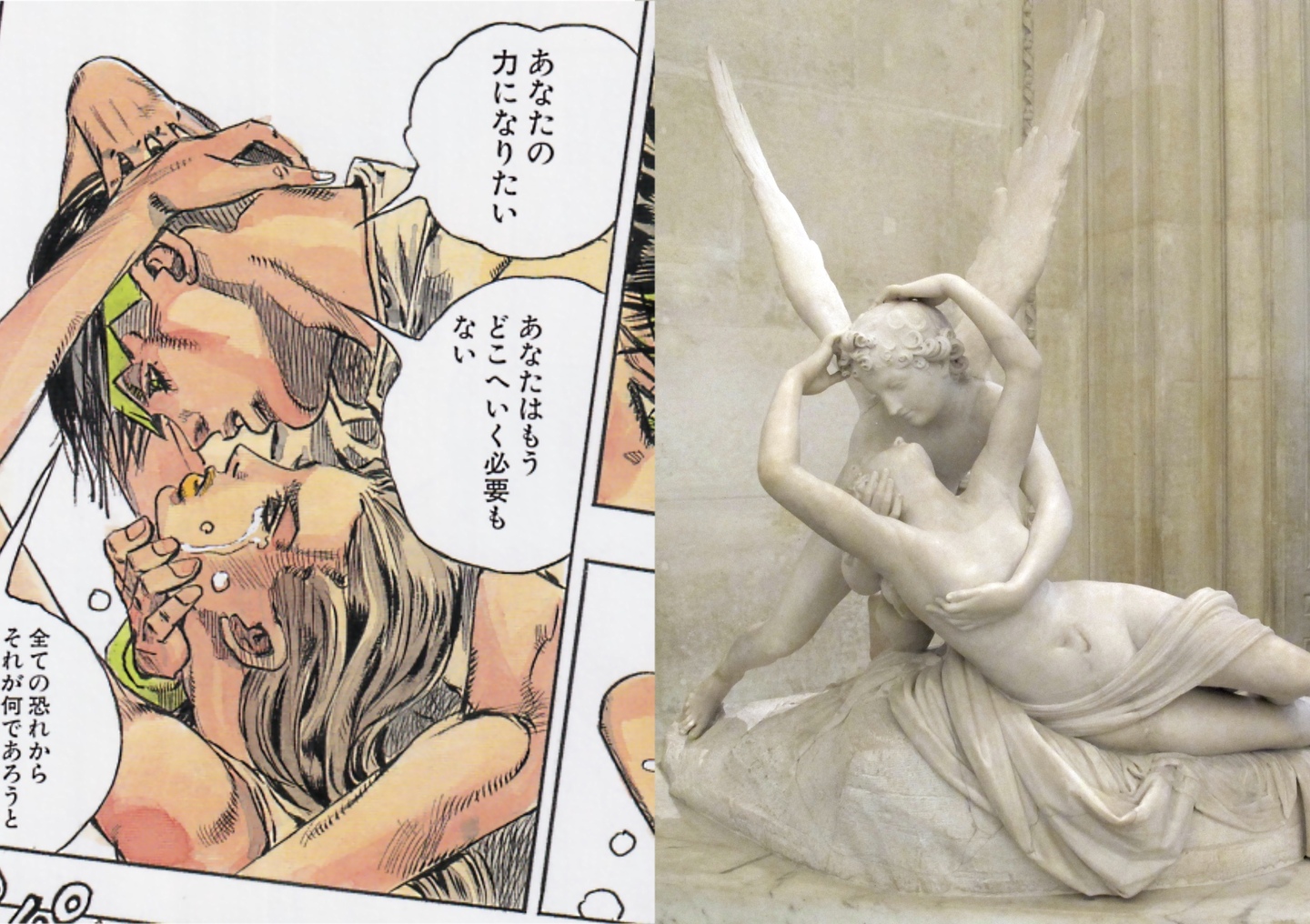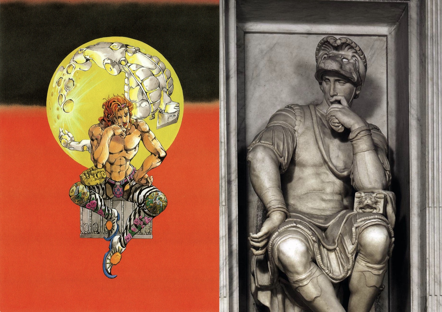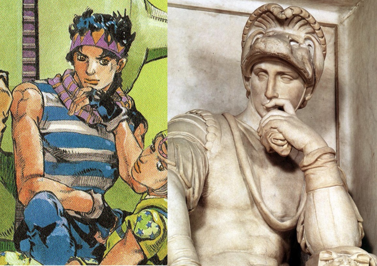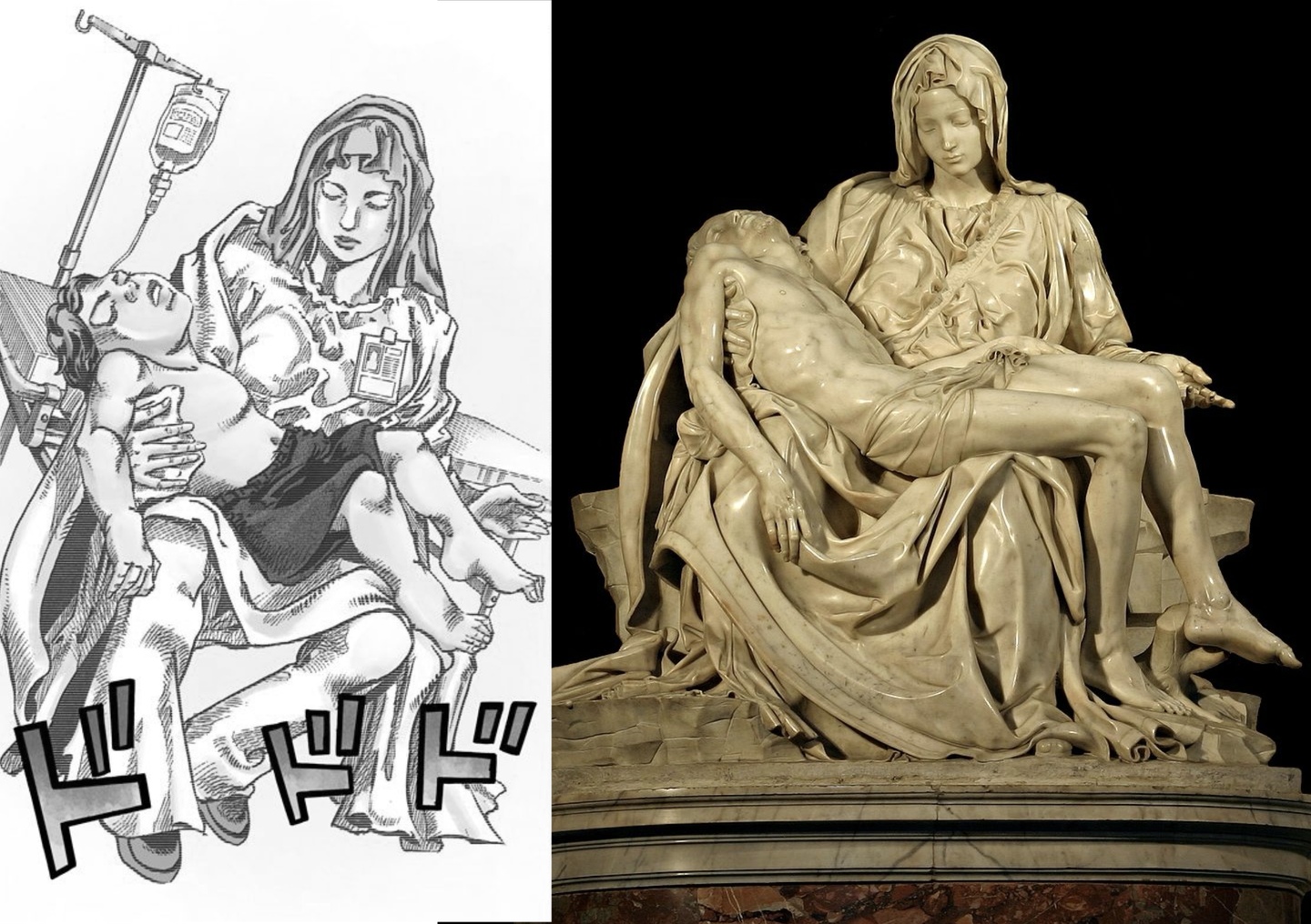 В «Невероятных приключениях Джо-Джо», помимо множества отсылок на поп-культуру, автор использует оммажи на классическую живопись, превращая их в ключевой элемент стиля и сюжета. Он использует этот прием не только для создания универсального языка для глобальной аудитории, но и для богатства изображения, например барочные позы идеально передают движение в статичном кадре, или используя знание сюжета картин зрителем для более глубинного понимания сюжета и подсказок к происходящему.