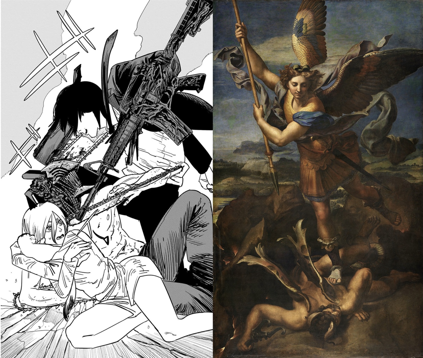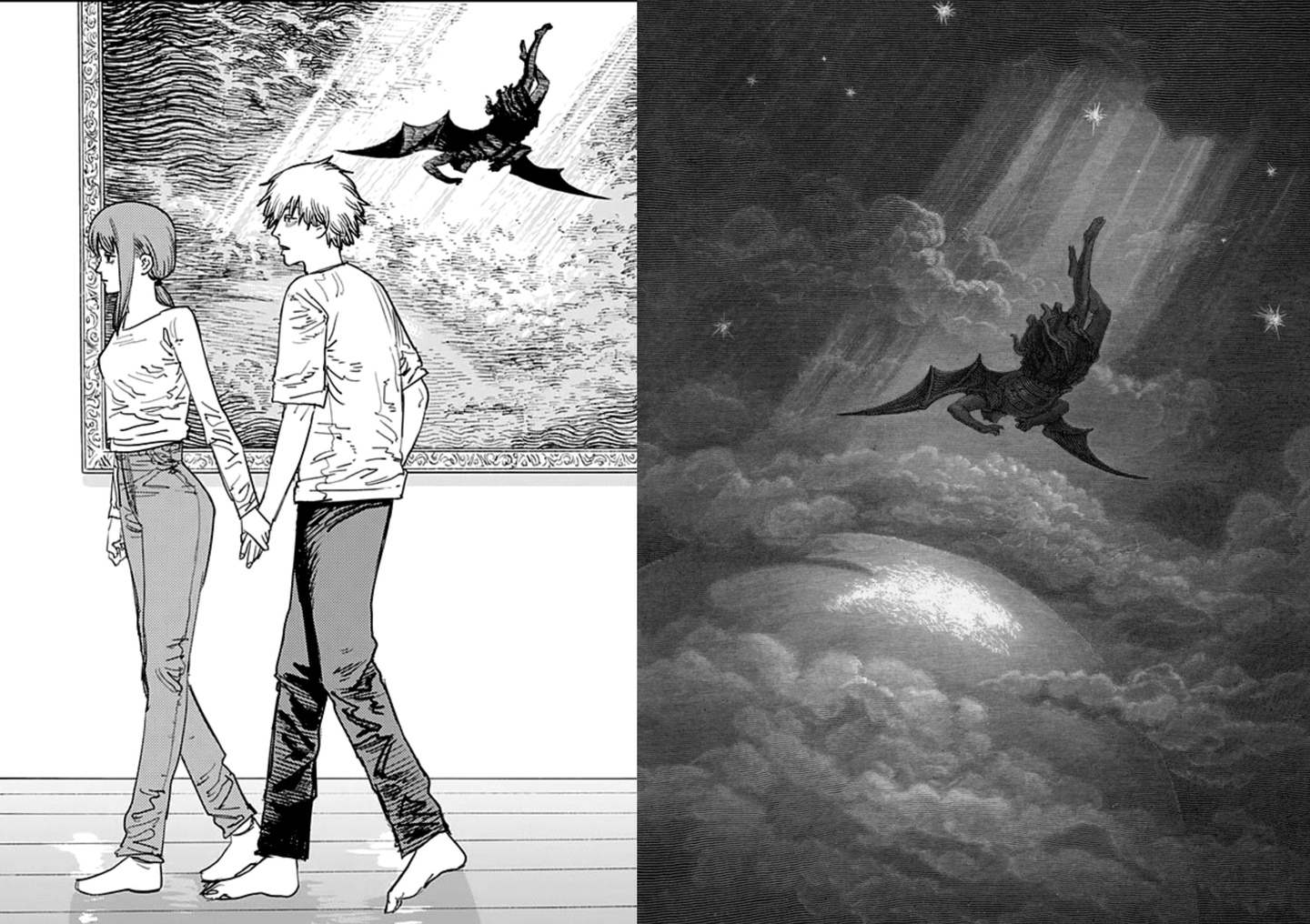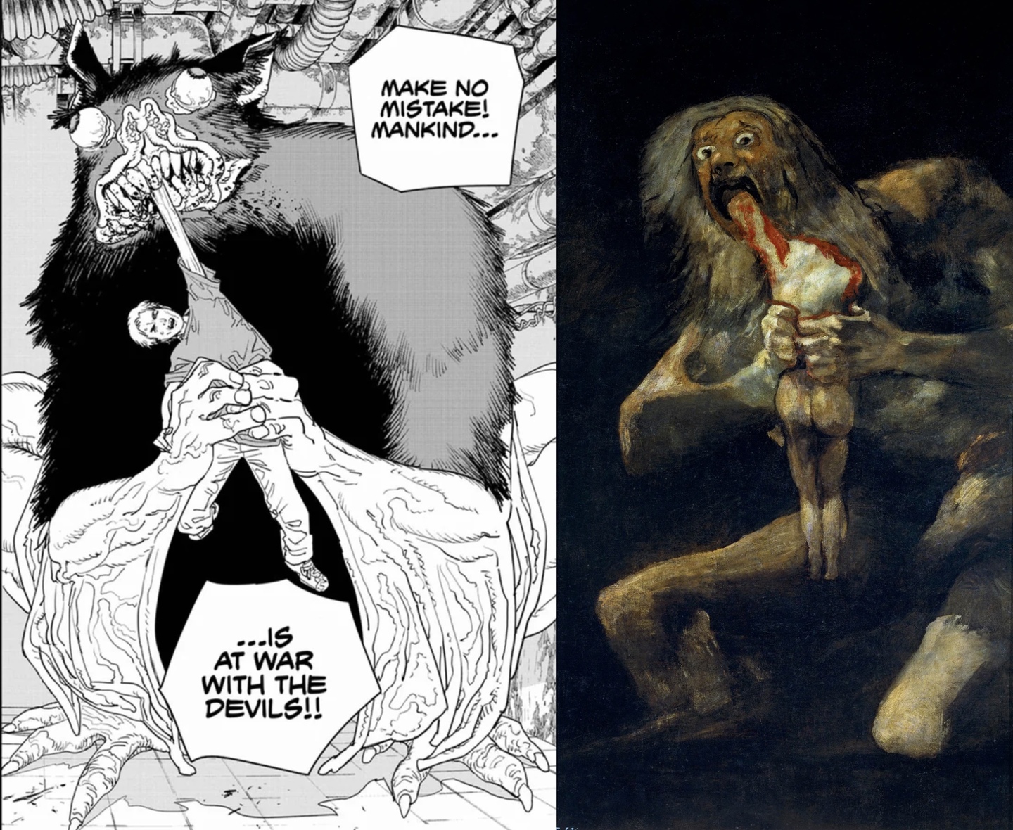 Chainsaw man by Tatsuki Fujimoto (2018-2022) and Paradise lost, Gustave Doré, 1855 and Saturn Devouring His Son by Goya 1820