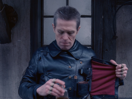Самым интересным персонажем, с точки зрения дизайна костюма, является Джоплинг. У него практически отсутствуют реплики, но зритель сразу понимает характер: черный гладкий кожаный плащ и темная цветовая палитра выделяют персонажа среди пастельно-розового сеттинга. Он выглядит будто сама смерть, внушает чувство опасности, говоря всем своим видом опасаться его. Но также, присутствует одна интересная деталь: когда Джоплинг распахивает плащ, мы видим внутренню красную прошивку. Как писалось ранее в исследовании, красный в фильмах Уэса Андерсона говорит о боли, печали или гневе. Внутрення прошивка говорит зрителю о том, что персонаж скрывает некие эмоции внутри, пряча под тем самым строгим темным плащом.