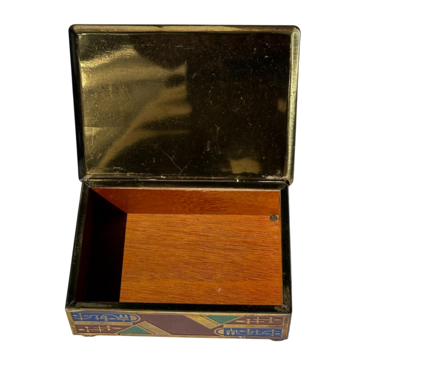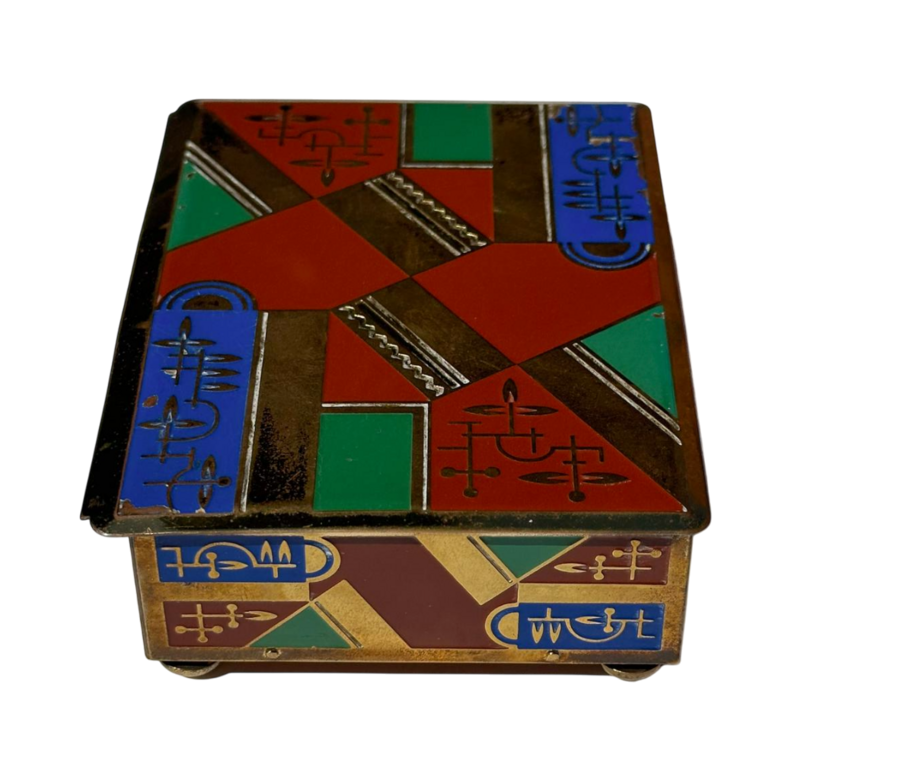 Яркий пример десятилетия — латунный или серебряный кейс с эмалью, украшенный геометрическими узорами (красный, синий, зелёный).