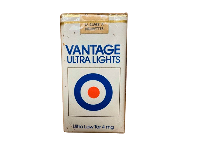Vantage Ultra Lights (1970-е) Упаковка в мягкой пачке, с ярким «таргет-паттерном» (круг) — дизайн очень чистый, геометричный, броский.