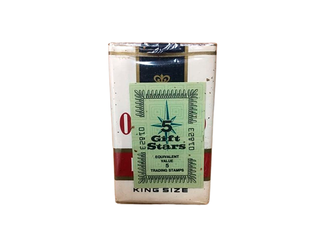 Old Gold Filters King Size (1970-е) Пачка с насыщенными цветами (красный, зелёный, белый), с акцентом на «5 Gift Stars» — ощущение яркого маркетинга, почти рекламной «игры», что созвучно с визуальной культурой 70-х.