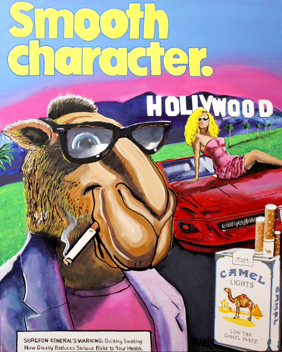 Изображение Joe Camel в «качестве рекламной иллюстрации»: он курит, держит пачку Camel, выглядит расслабленным и уверенным. Такой образ добавляет «геройства» и бунтарства: герой, который сам себе «воплощение свободы и расслабленности». Графика яркая, мультяшная, с характерной стилизацией — именно то, что может ассоциироваться с «агрессивным маркетингом» через персонажа.