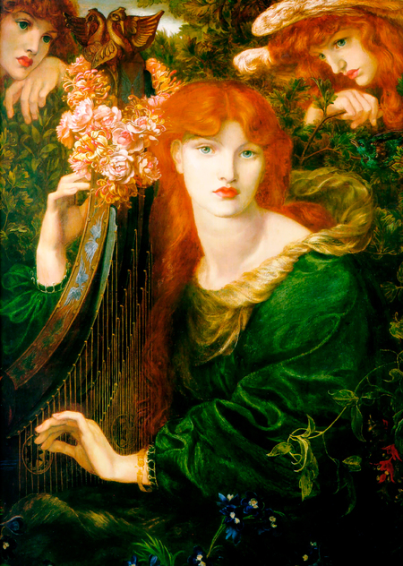 Любопытно, что в то время как в средневековой традиции рыжий считался «цветом инаковости»[1] и предательства, отсылая к образу Иуды, у прерафаэлитов этот цвет приобретает особое значение. Очень часто в их картинах можно встретить образы героев именно с рыжими волосами. Можно заметить, что на картине Россетти лишь девушка в центре, являющаяся главной героиней сюжета, имеет эту деталь внешности. Это может означать, что использование оранжевого и рыжего цвета для написания волос героев подчёркивало их индивидуальность и особенность, выделяя из общей толпы.