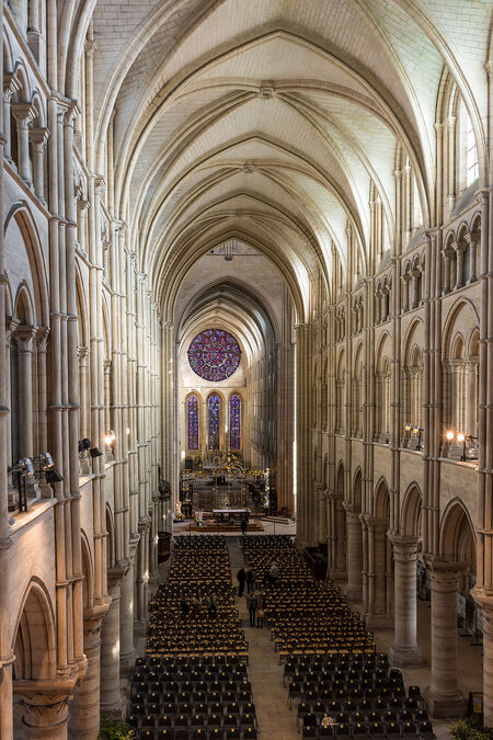 Суассонский собор отличается строгой вертикальностью, узкими высокими окнами и утонченной пластикой капителей. Так же является одним из крупнейших готических кафедралов Франции.