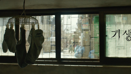Камера следует за героями по маршруту «вверх-вниз»: изначальный подъем Ким Ки Ву в дом Пак, как поднятие по социальной лестнице и сцена после ливня: семья Ким спускается по бесконечным лестницам от богатого дома к своему полуподвалу.