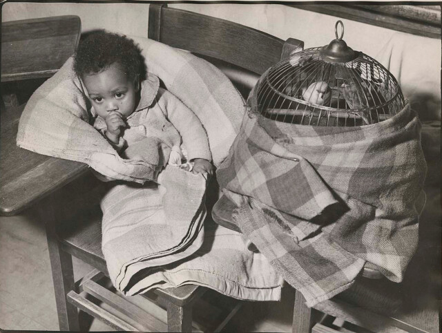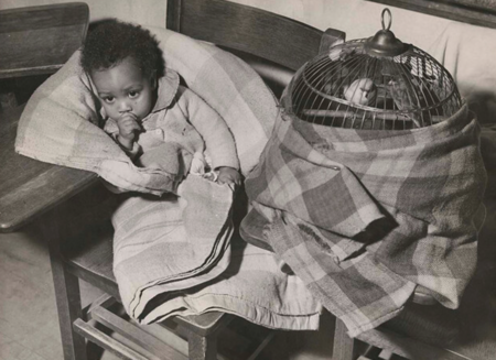 Маргарет Бурк-Уайт. Одинокий маленький афроамериканский ребенок сосет большой палец рядом с накрытой клеткой канареек. 1937 год. https://cameralabs.org/aeonmedia/zenfoto/9882/63470/margaret-burk-uajt_thumbnail.jpg (дата обращения: 16.11.2025)