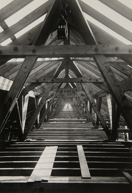 Для Бурке-Уайт ракурс — не эффект, а способ конструировать отношение зрителя к объекту. Высокие точки съёмки дают ощущение контроля над пространством, низкие — подчёркивают масштаб и давление конструкции. Контраст ракурсов позволяет ей показать индустрию не статично, а как систему сил и напряжений, в которой человек и машина существуют на новых условиях.