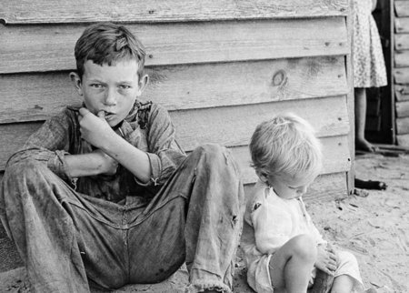 Уокер Эванс. В южных штатах. 1936 год. Маргарет Бурк-Уайт. Одинокий маленький афроамериканский ребенок сосет большой палец рядом с накрытой клеткой канареек. 1937 год.