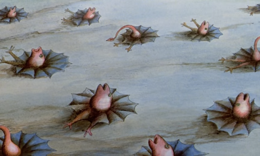 У Босха человек кажется потерянным, слабым и подверженным искушениям. В «Дикой планете» Лалу показывает похожую идею: люди тоже малы в масштабе окружающего их мира, их держат как домашних питомцев, угнетают.