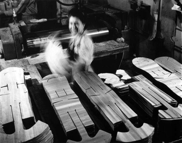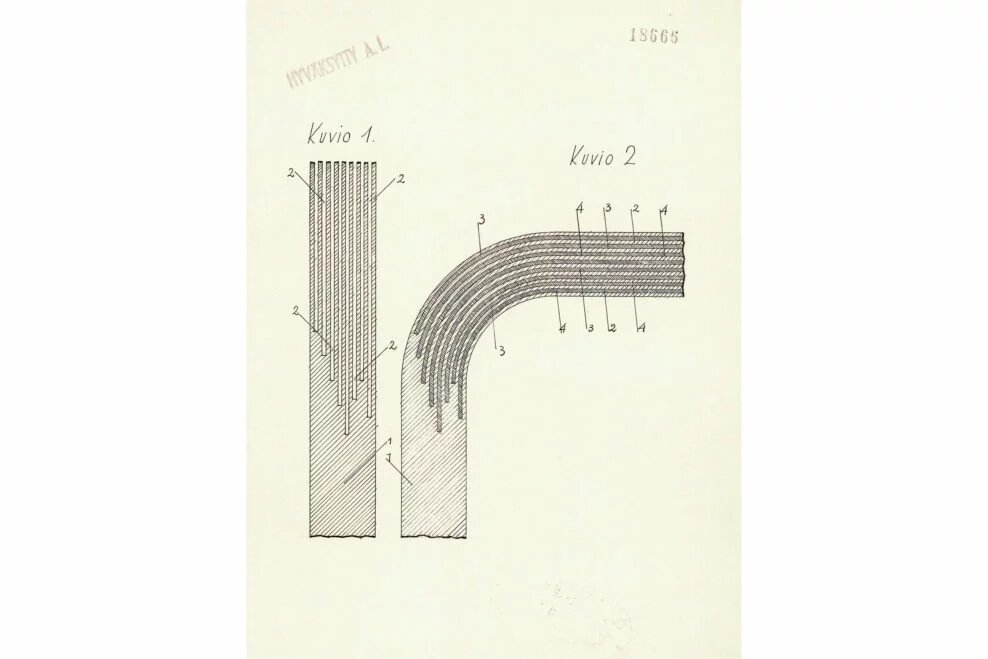 Технологическая школа Аалто закрепилась в «L-ноге» и табурете Stool 60 (1933): в массив берёзы выполнялись продольные пропилы, в которые вклеивались шпоновые ламели; заготовку гнули под 90°, получая прочную Г-образную опору. Приём был запатентован и положил начало системе стандартизованных компонентов для десятков моделей. Простая геометрия узлов, штабелирование и поставка «вразборе» обеспечили долговечную серию, которая выпускается до сих пор.