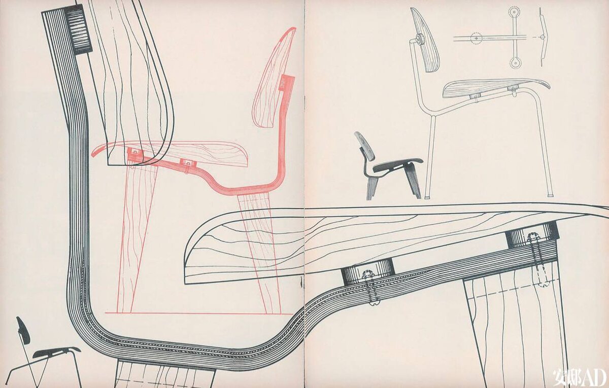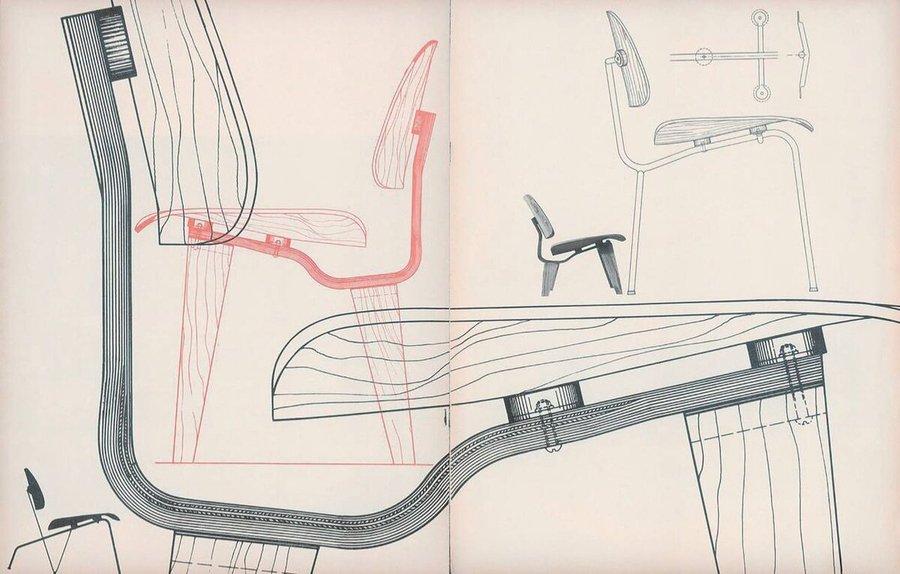 Поворотный шаг — серия Plywood Group (1945–1946): LCW, DCW, DCM. Сиденье и спинка формуются отдельно и соединяются через «позвоночник»; резиновые амортизаторы (shock mounts) гасят вибрации и разгружают клеевые швы, а базы выполняются из дерева или стальной трубки.