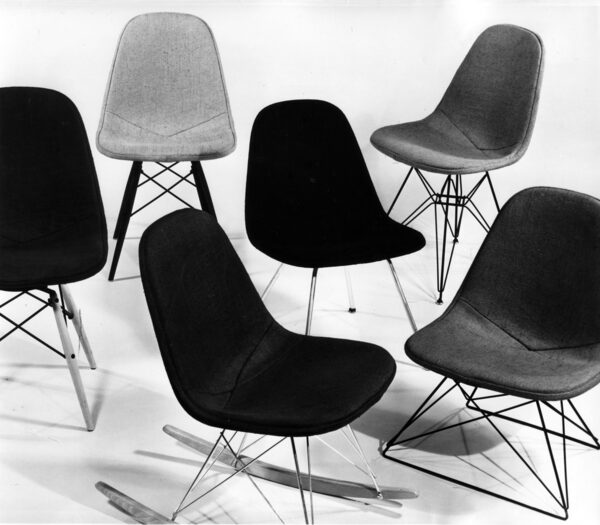 Стартом массовой «пластиковой» эпохи стали оболочки Имзов: Eames Molded Fiberglass/Plastic (1950). Армированный пластик, разработанный для конкурса MoMA «Low-Cost Furniture», дал цельную сидячую «раковину», совместимую с разными базами — деревянной, металлической, на полозьях-качалках. Сочетание сменных оснований и одной оболочки упростило производство, логистику и сервис, а пластик впервые выступил в роли самостоятельной видимой поверхности без обивки.