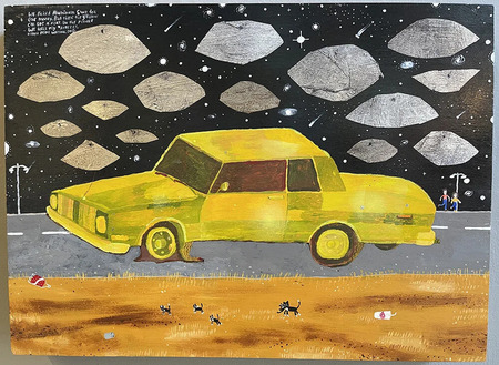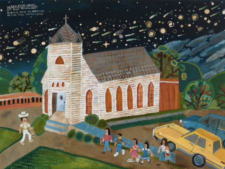 Даже самые обыденные сцены, например поход в церковь или поездка на машине, всегда дополняются у неё космическими летающими тарелками или астероидами. Эти мистические элементы стали неотъемлемой частью её художественного языка.