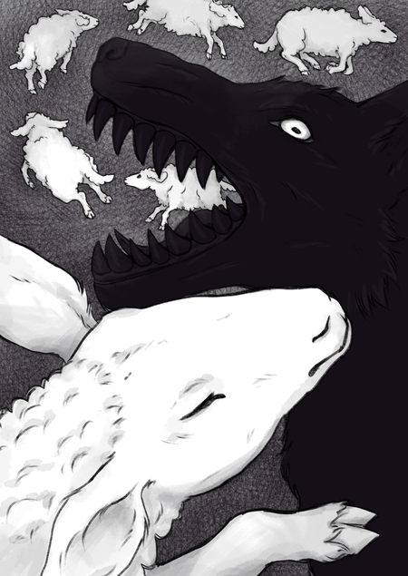 Овцеволк — существо двойственной природы, не вписывается ни в стаю волков, ни в стадо овец — и те, и другие чувствуют в нём фальшь и прогоняют прочь. Метаясь между двумя мирами, он в итоге раскрывает свою суть: его внутренний волк расправляется с овцой, а ягненок даёт отпор волкам. Цена обретённого уединения — непримиримость с обеими сторонами своей натуры.