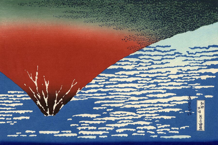 Кацусика Хокусай. «Южный ветер. Ясный день». Цветная гравюра на дереве. 1823—1831. Из серии «Тридцать шесть видов Фудзи»