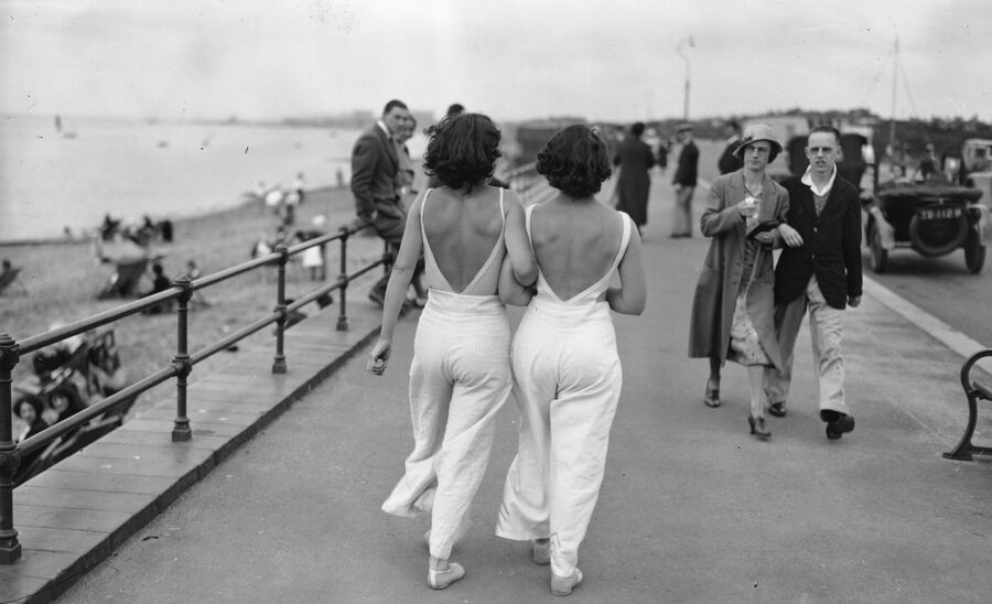 1. Две одинаковые пижамы вызывают удивление у остальных посетителей Торп-Бей. Джей Э. Хэмптон. 2. Группа женщин в пляжных пижамах с более широким вырезом сзади (1934). Архив Халтона