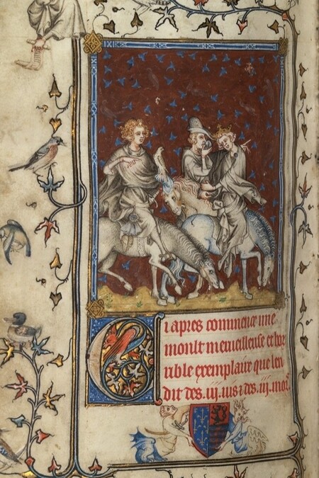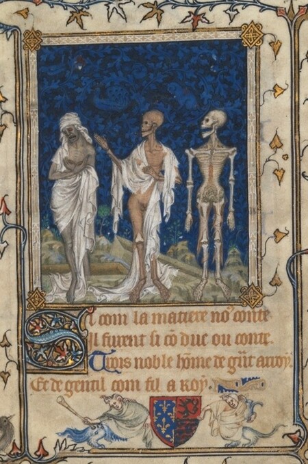 Жан ле Нуар, «Три живых и три мёртвых», Миниатюра из Псалтыря Бонны Люксембургской, ок. 1348–1349