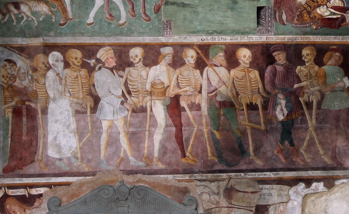 Сам жанр Danse Macabre оформился несколько позднее, под влиянием разрушительных событий XIV века. Ключевую роль сыграло распространение Черной смерти (эпидемии бубонной чумы 1347–1353 гг.), погибло до трети населения Европы. Постоянная близость смерти нашла отражение в искусстве того времени. Уже в 1424 году в Париже возникает первый полноценный цикл пляски смерти — стенная роспись на кладбище Святых Невинных. Эту дату принято считать рождением жанра Danse Macabre как такового. Еще одним фактором могли быть средневековые карнавальные традиции и театр. Ученые отмечают сходство поз и жестов скелетов с реальными танцевальными движениями того времени. Возможно, на кладбищах или городских площадях устраивали костюмированные сценки с фигурой Смерти, что вдохновило художников на создание настенных танцев смерти.