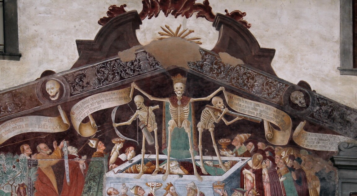 Идея всеобщего торжества Смерти над живыми оформилась в Европе на рубеже XIII–XIV веков. Её истоки прослеживаются в фольклоре и литературе: так, во Франции около 1280 года появляется легенда о «Трех живых и трех мертвых» — рассказ о трёх молодых вельможах, встретивших трёх воскресших мертвецов, которые поучают их: «Вы неизбежно станете такими же безобразными, как мы… Помните о быстротечности жизни!» [1]. Этот сюжет получил распространение в виде миниатюр и настенных росписей, он содержал важный мотив равенства всех перед смертью, встречающийся и в композиции будущих плясок смерти.