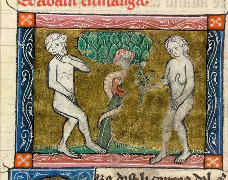 Мастер Бусико. Адам и Ева. Иллюстрация из книги: Джованни Боккаччо «О судьбах выдающихся мужчин и женщин». Ок. 1413–1415 гг. Музей Гетти, Лос-Анджелес.