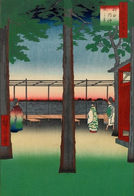 Скаковой круг в Хацунэ-но баба в квартале Бакуроте. Серия «100 знаменитых видов Эдо». Утагава Хиросигэ; Святилище Канда-медзин на рассвете. Серия «100 знаменитых видов Эдо». Утагава Хиросигэ.