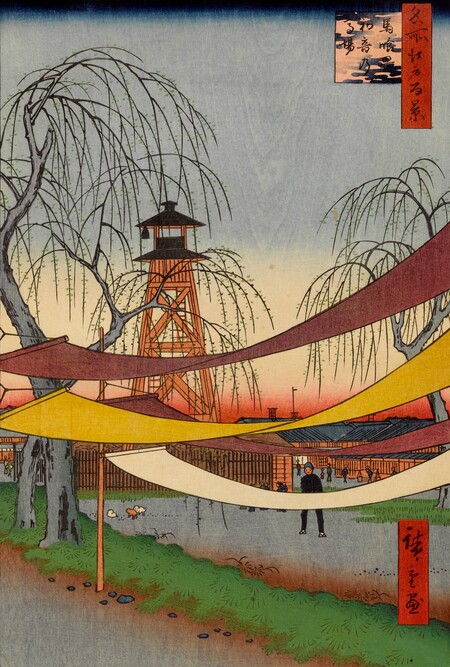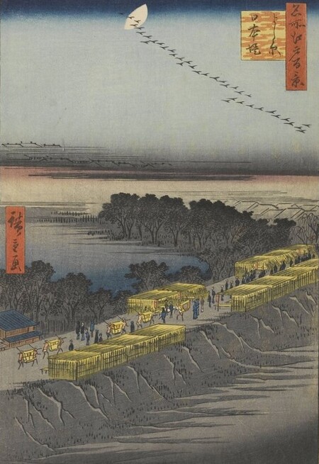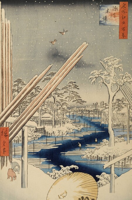 Холм Юхиноока и Тайкобаси мост в Мэгуро. «100 знаменитых видов Эдо». Утагава Хиросигэ; Дровяные склады в Фукагава. Серия «100 знаменитых видов Эдо». Утагава Хиросигэ.