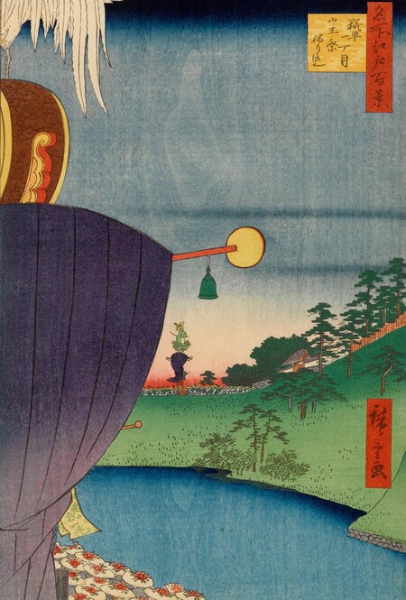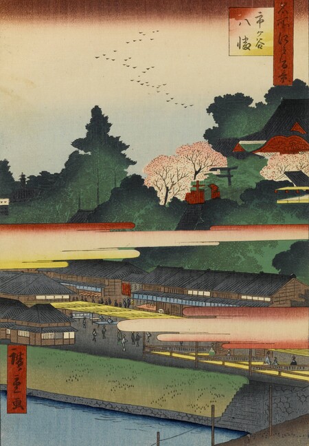 Цветочный павильон на склоне Дангодзака в Сэндаги. Серия «100 знаменитых видов Эдо». Утагава Хиросигэ; Святилище Хатиман в Итигая. Серия «100 знаменитых видов Эдо». Утагава Хиросигэ.