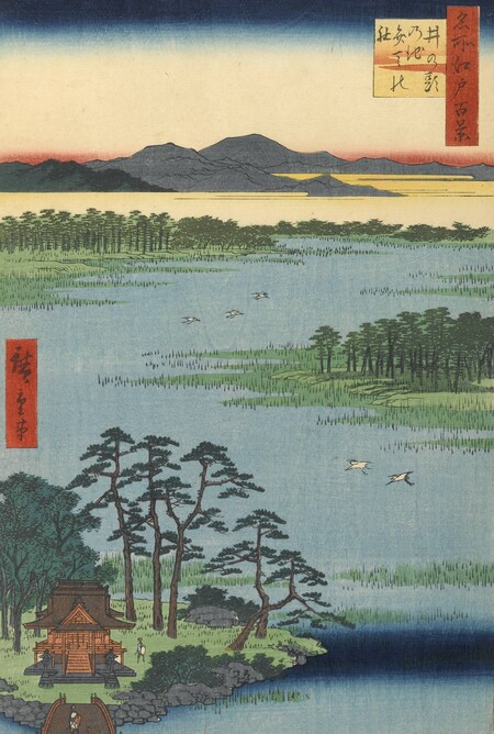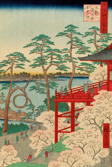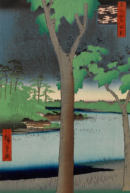 Киемидзудо Храм и пруд Синобадзу-но. Серия «100 знаменитых видов Эдо». Утагава Хиросигэ; Святилище Суйдзин-но мори и местность у реки Сумидагава. Серия «100 знаменитых видов Эдо». Утагава Хиросигэ