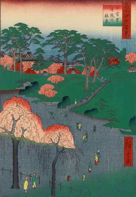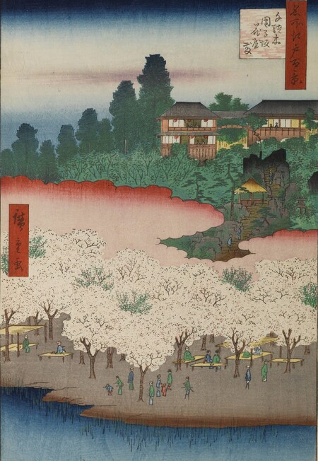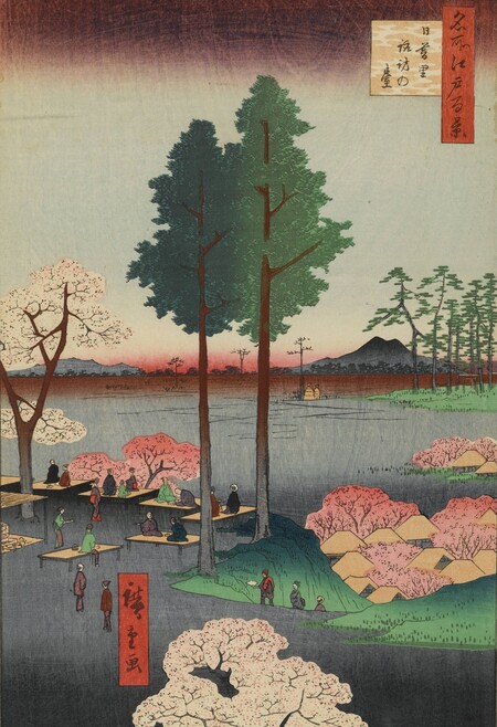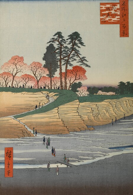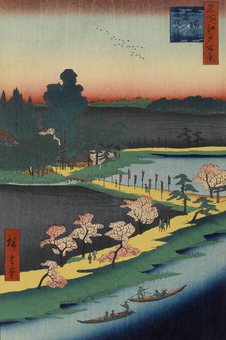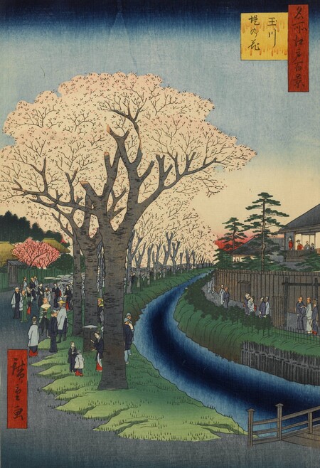 Монастырские сады в Ниппори. «100 знаменитых видов Эдо». Утагава Хиросигэ; Деревья сакуры вдоль дамбы реки Тамагава. Серия «100 знаменитых видов Эдо». Утагава Хиросигэ.