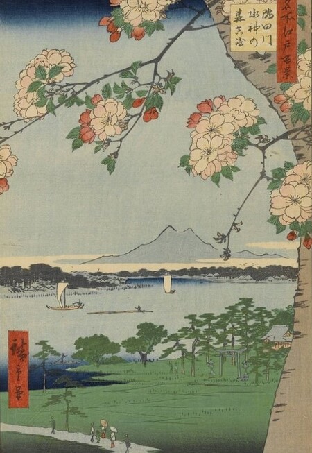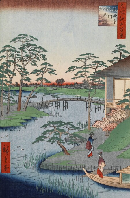 Святилище Массаки на реке Утигава. «100 знаменитых видов Эдо». Утагава Хиросигэ; Монастырь Дзэнкодзи у переправы в Кавагути-но ватаси. Серия «100 знаменитых видов Эдо». Утагава Хиросигэ.