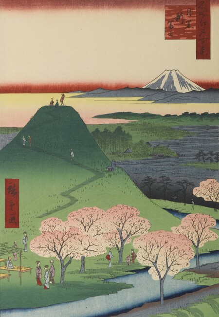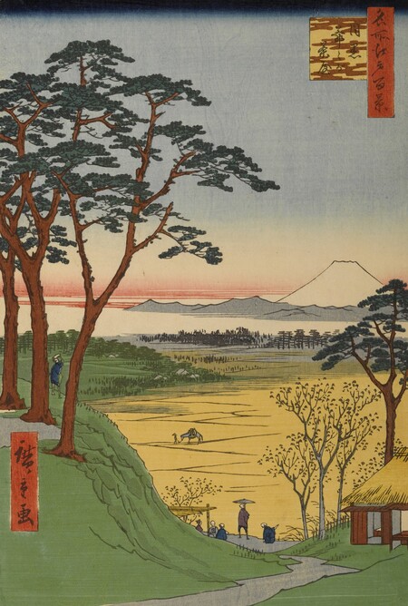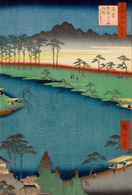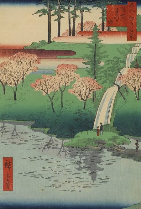 Мэгуро, пруд Тиегаикэ. Серия «100 знаменитых видов Эдо». Утагава Хиросигэ; Мэгуро, Новая Фудзияма. Серия «100 знаменитых видов Эдо». Утагава Хиросигэ.