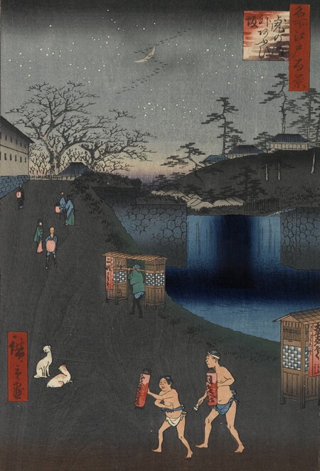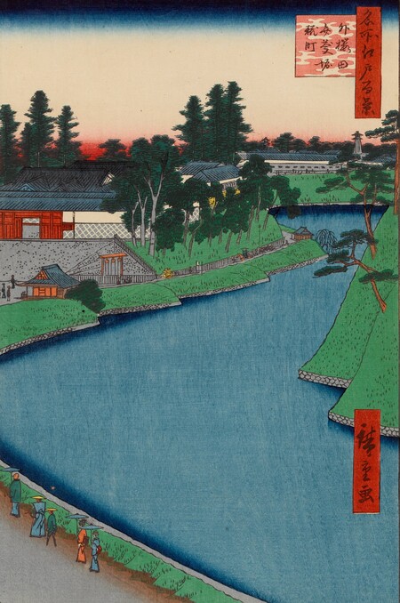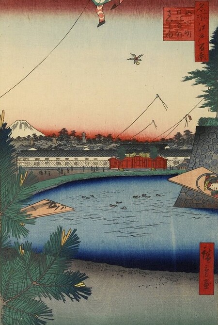 Акасака, Плантация павлоний. «100 знаменитых видов Эдо». Утагава Хиросигэ; Канал Бэнкэйбори от Сото-Сакурада в направлении Кодзимати. Серия «100 знаменитых видов Эдо». Утагава Хиросигэ.