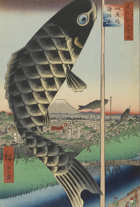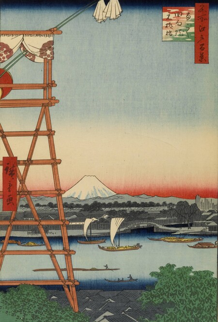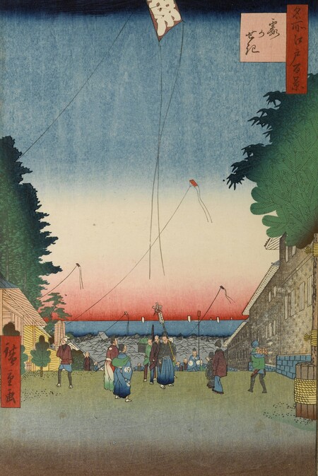 Утагава Хиросигэ обращает внимание на мгновение полной гармонии между городом, его жителями и природой. Динамика жизни города прослеживается в воздушных змеях, находящихся в облаках и ставших метафорой человеческой свободы.