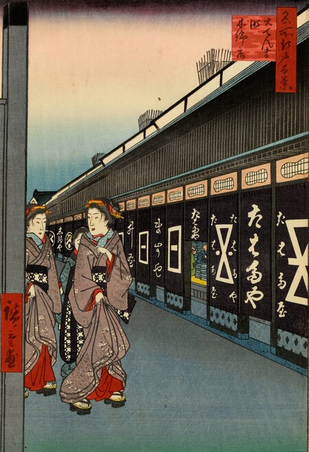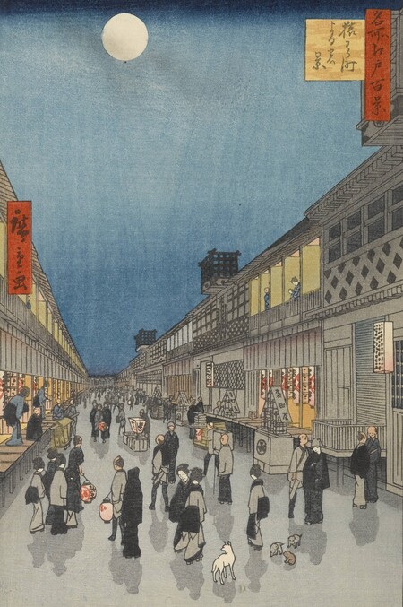Ночной вид на квартал Сарувака-мати. «100 знаменитых видов Эдо». Утагава Хиросигэ; Набережная Нихондзуцуми, квартал Ёсивара. Серия «100 знаменитых видов Эдо». Утагава Хиросигэ.
