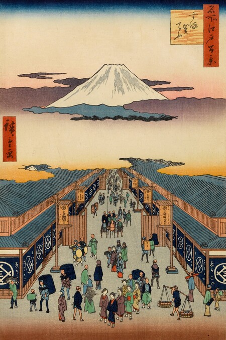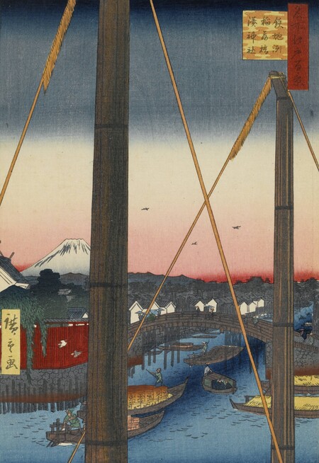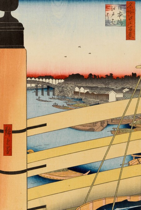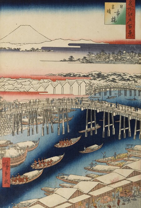 Мост Нихонбаси в ясную погоду. «100 знаменитых видов Эдо». Утагава Хиросигэ; Остров Цукудадзима от моста Эйтайбаси. Серия «100 знаменитых видов Эдо». Утагава Хиросигэ.