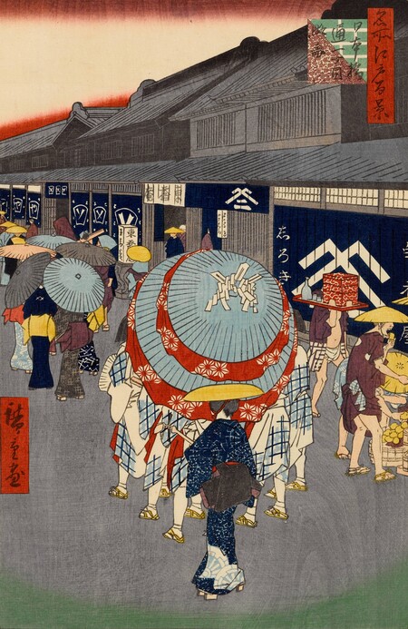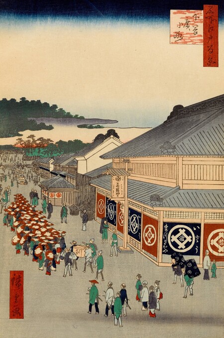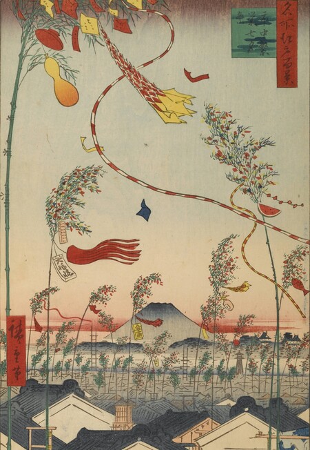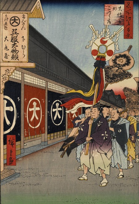 Украшенный город, праздник Танабата. «100 знаменитых видов Эдо». Утагава Хиросигэ; Магазины тканей в квартале Одэммате. Серия «100 знаменитых видов Эдо». Утагава Хиросигэ.