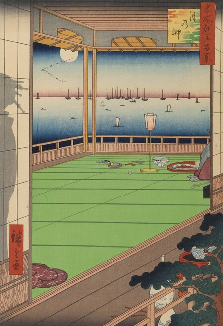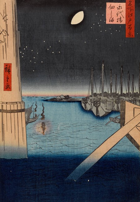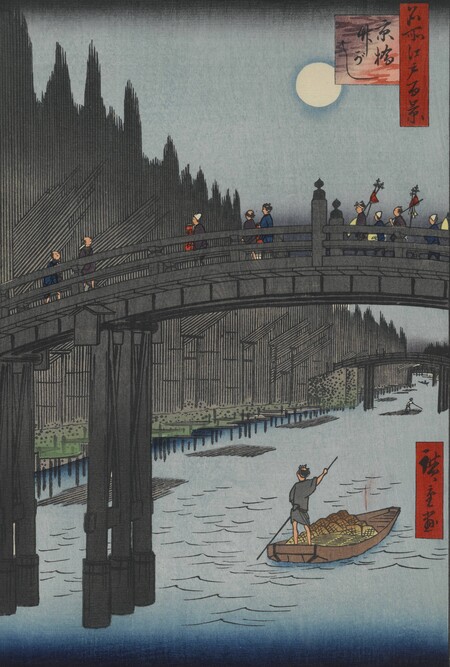 Мост Кёбаси и набережная Такэгаси. «100 знаменитых видов Эдо». Утагава Хиросигэ; Луна над мысом. Серия «100 знаменитых видов Эдо». Утагава Хиросигэ.