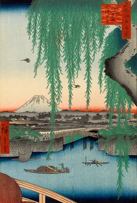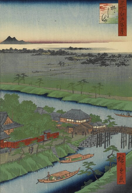 Монастырь Экоин в Регоку и мост Янагибаси. «100 знаменитых видов Эдо». Утагава Хиросигэ; Янагисима (Ивовый остров). Серия «100 знаменитых видов Эдо». Утагава Хиросигэ.