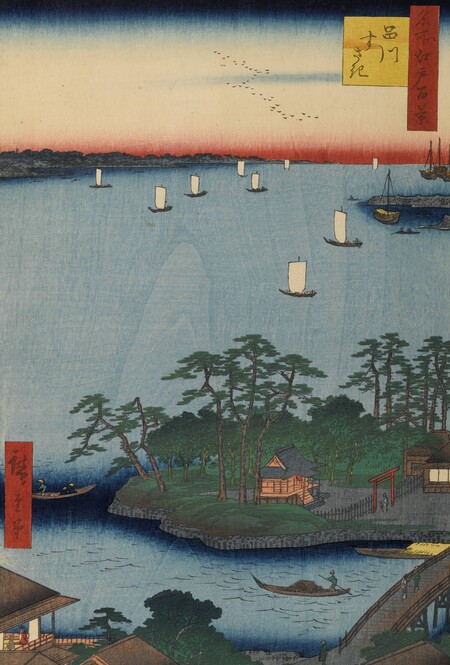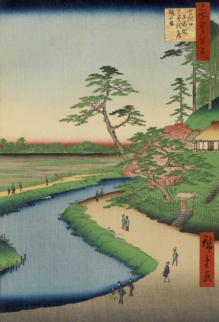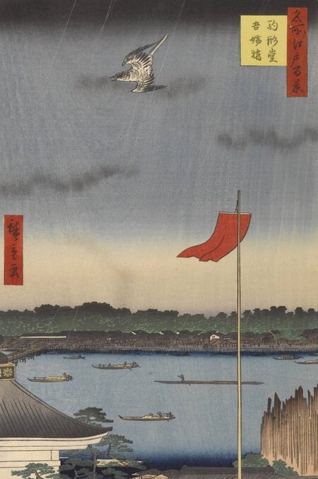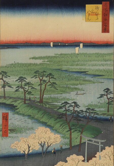 Садзаэ Храм Монастыря Гохякуран (Пятисот Архатов). «100 знаменитых видов Эдо». Утагава Хиросигэ; Устье реки Накагава. Серия «100 знаменитых видов Эдо». Утагава Хиросигэ.