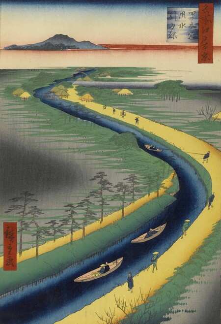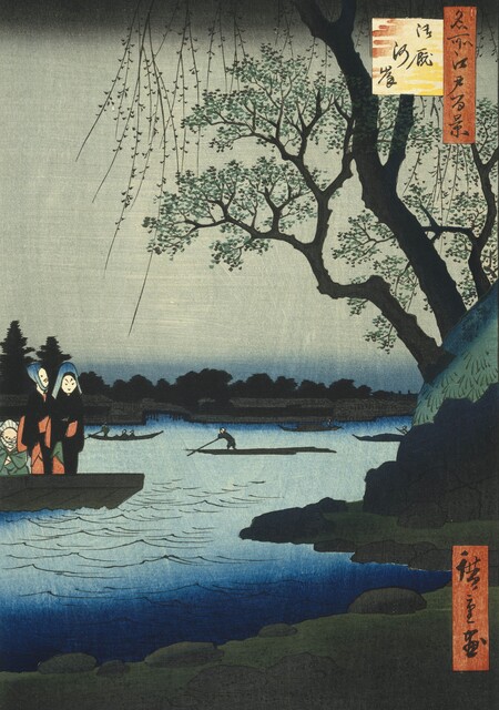 Асакусагава Река, река Миятогава, набережная Окавабата. «100 знаменитых видов Эдо». Утагава Хиросигэ; Река Аясэгава, Пучина Колокола. Серия «100 знаменитых видов Эдо». Утагава Хиросигэ.