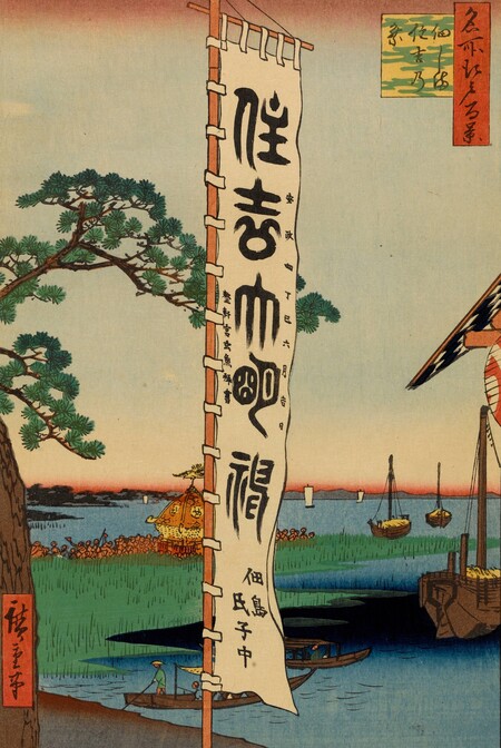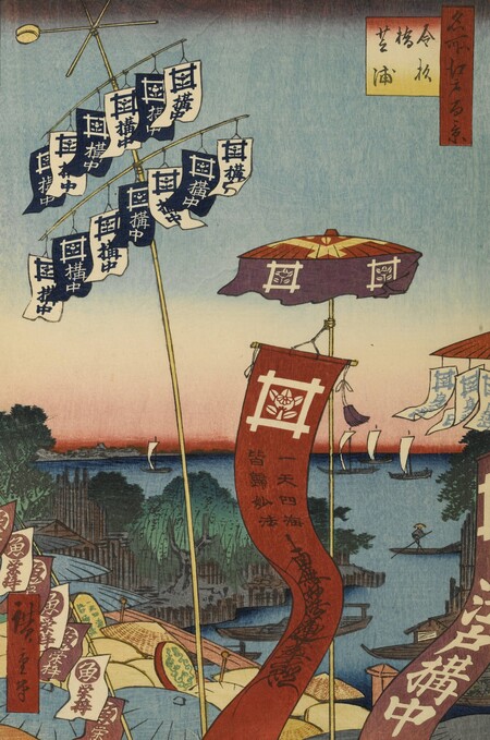 Цукудадзима, праздник святилища Сумиеси. «100 знаменитых видов Эдо». Утагава Хиросигэ; Праздничная процессия Санно в Кодзимати. Серия «100 знаменитых видов Эдо». Утагава Хиросигэ.