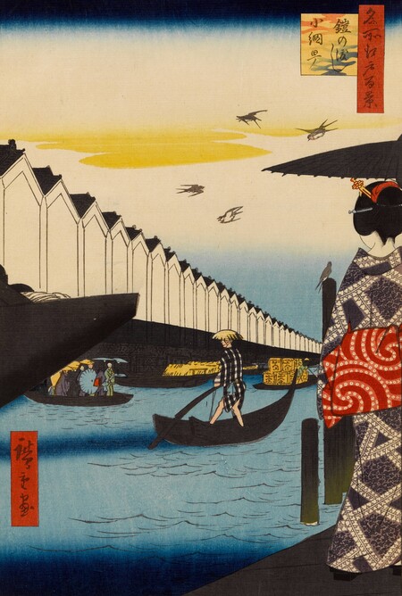 Набережная Коумэ. «100 знаменитых видов Эдо». Утагава Хиросигэ; Переправа Ниидзюку. Серия «100 знаменитых видов Эдо». Утагава Хиросигэ.