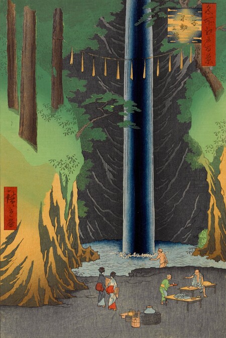 Переправа Ерои-но ватаси к кварталу Коамите. «100 знаменитых видов Эдо». Утагава Хиросигэ; Водопад Фудо-но таки в Одзи. Серия «100 знаменитых видов Эдо». Утагава Хиросигэ.