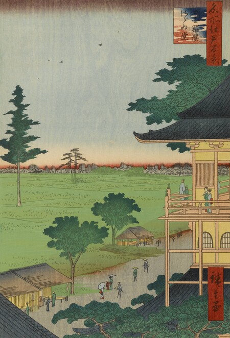 Вид с холма святилища Тэндзин в Юсима. «100 знаменитых видов Эдо». Утагава Хиросигэ; Монастырь Кинрюдзан в Асакуса. Серия «100 знаменитых видов Эдо». Утагава Хиросигэ.