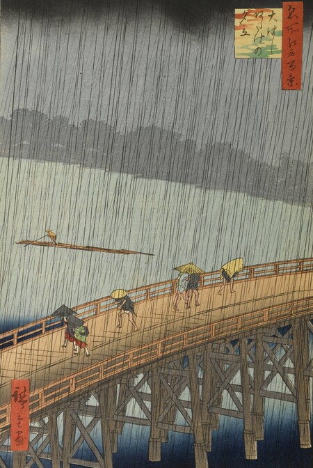 Ливень над мостом Охаси, местность Атакэ. «100 знаменитых видов Эдо». Утагава Хиросигэ; Храм Комакатадо и мост Адзумабаси. Серия «100 знаменитых видов Эдо». Утагава Хиросигэ.