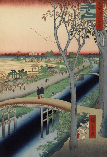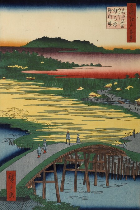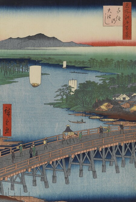 Монастырь Мокубодзи, река Утигава и поля Годзэнсаихата. «100 знаменитых видов Эдо». Утагава Хиросигэ; Мост Охаси в Сэндзю. Серия «100 знаменитых видов Эдо». Утагава Хиросигэ.